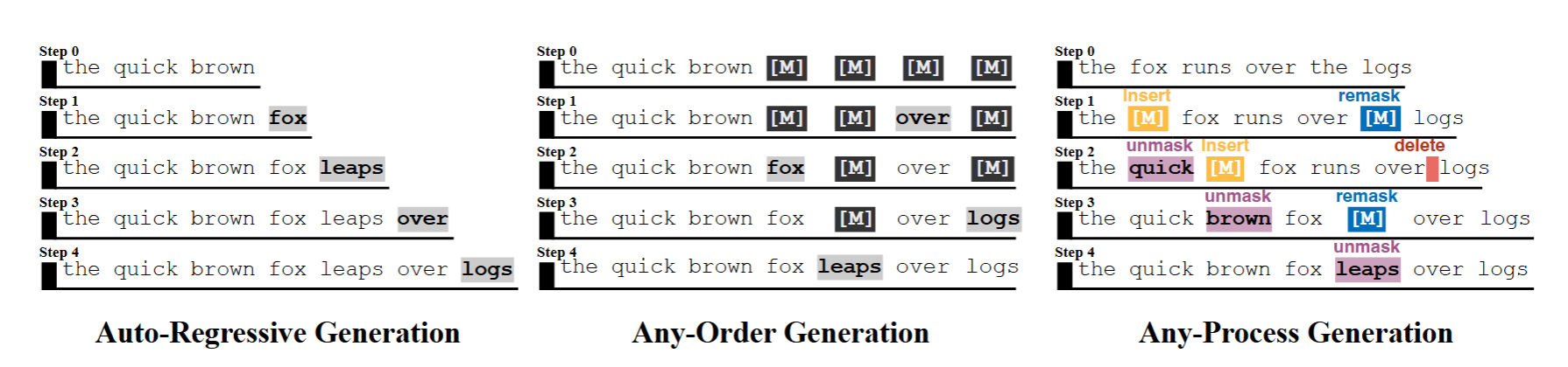 - [Oct. 2025] Check out our new papers providing fundamental thoughts on language generation and reasoning paradigm: diffusion v.s. AR (Any Process Generation) and continuous v.s. discrete (CCDD)!